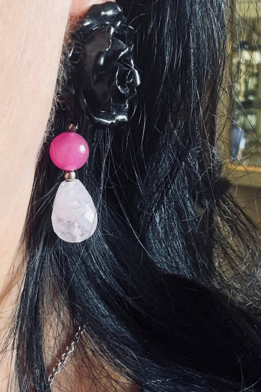 BOUCLES D'OREILLES CLIP FLEUR EN RESINE ET QUARTZ ROSE