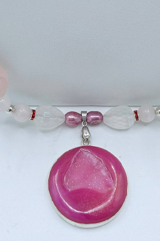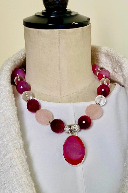 Collier en quartz rose Barbie, agates fushia, argent et pendentif quartz rose fushia