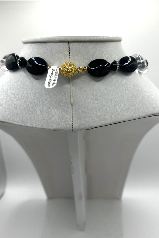 Ras du cou cristal de roche en coeur et gros coeur en Murano avec fleur en onyx