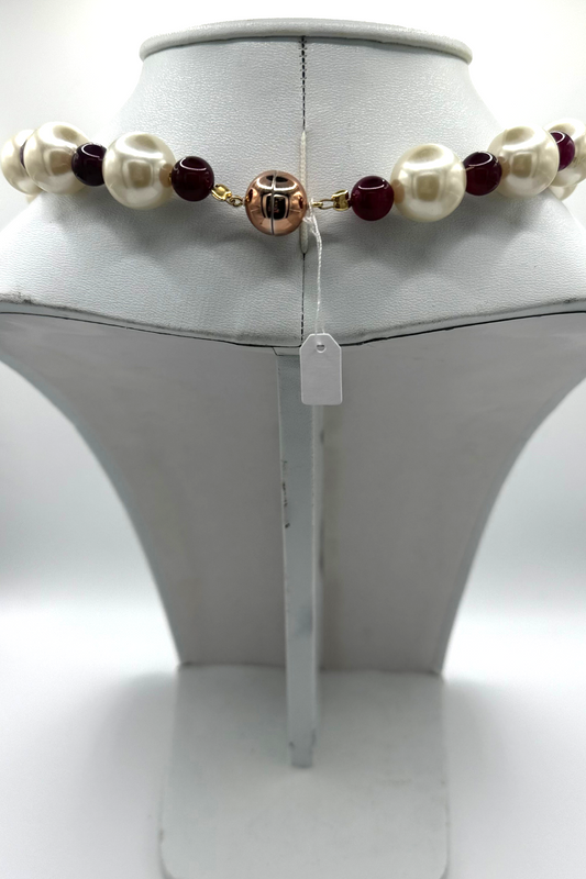 Collier ras du cou perles fantaisie blanches et agates roses fushia