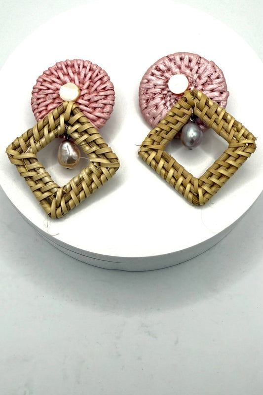 BOUCLES D'OREILLES CLIPS EN RAFIA BEIGE ET ROSE PERLES GRISES