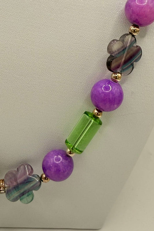 SAUTOIR JADE PARME,CRISTAL VERT et AMETHYSTES FLEUR MAUVE