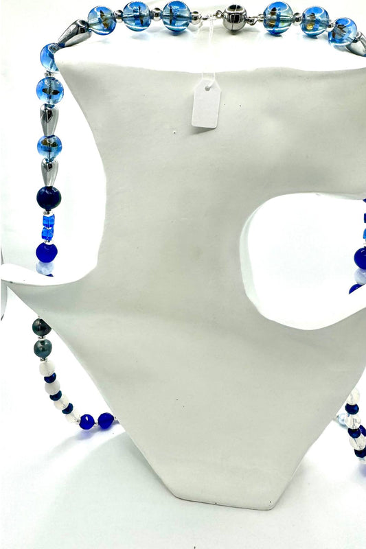 Sautoir bleu cobalt, gris et blanc en pierres et perles naturelles