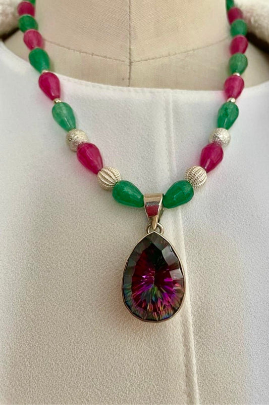 Collier en argent jade vert et agates roses fushia pendentif topaze mystique