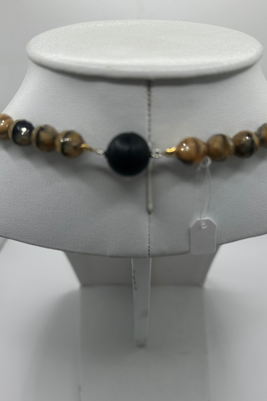 Collier oeil-de-tigre, perles fantaisie et nacre sur noix de coco