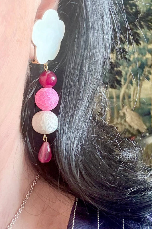BOUCLES D'OREILLES CLIPS NACRE FLEURS AGATES ROSES ET BRIOLETTES
