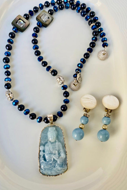 Sautoir perles de cristal bleu indigo et pendentif Buddha en aigue-marine ciselée