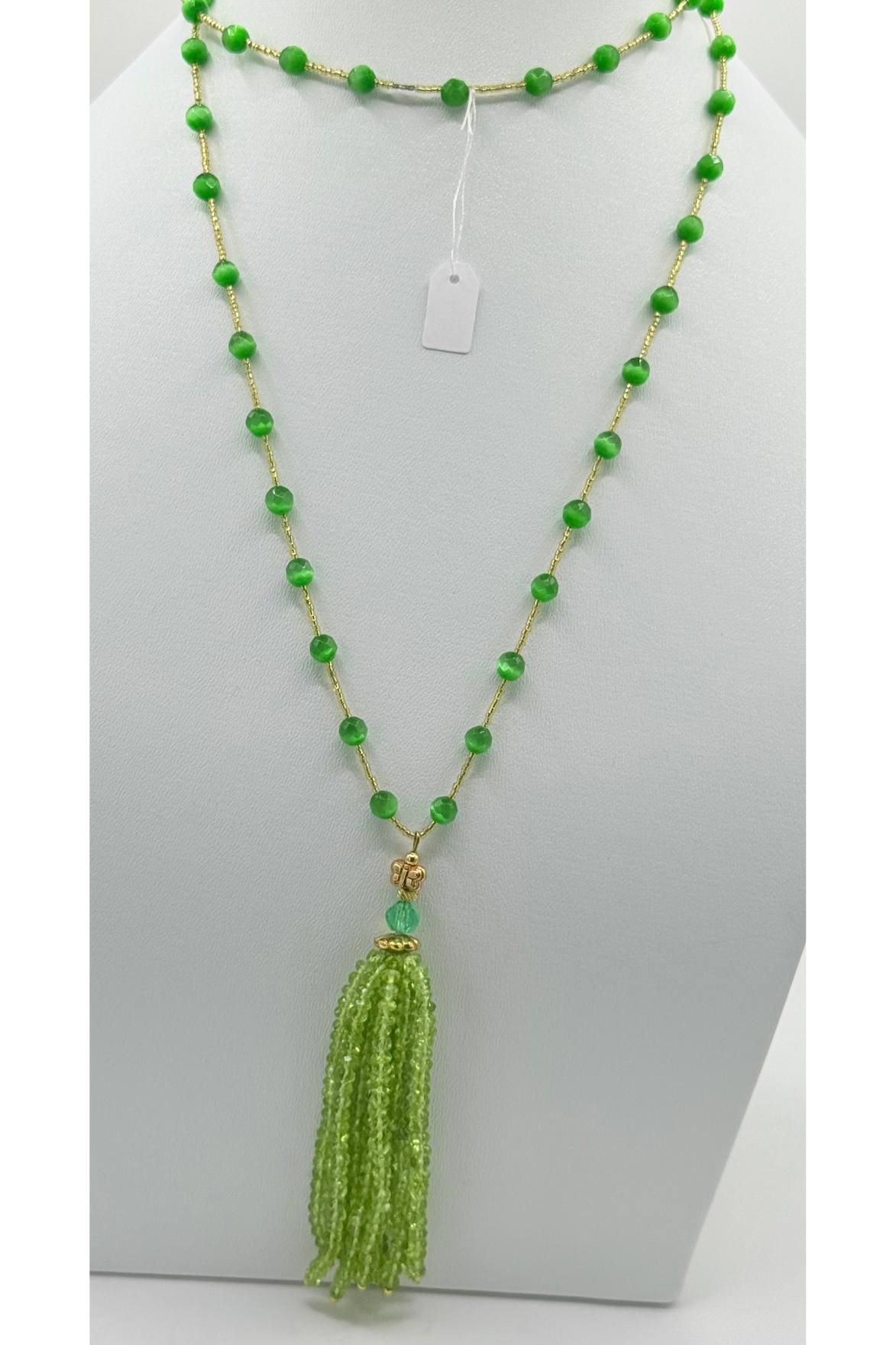 Sautoir long de 45 cm de long (90cm en tout) en oeil de chat vert translucide plus 9 cm de pompon en perles de péridot. Petites perles dorées rocailles intermédiaires entre les perles en oeil de chat vert vif.